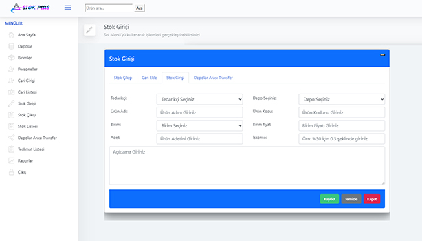 StokPlus ile stoklarınızı gerçek zamanlı takip edin, stok arama işlemlerinizi hızlandırın ve depo yönetiminizi profesyonelleştirin. Envanter kayıplarını %99'a kadar azaltın. Anlık olarak Stok Ekleme, Stok Çıkışı, Cari Ekleme ve Depo'dan Depo'ya transfer işlemlerinizi gerçekleştirebilirsiniz. Kullanımı çok Basit Ama güçlü bir yazılım. AspNet Core Mvc Alt Yapısı ile karşınızda.